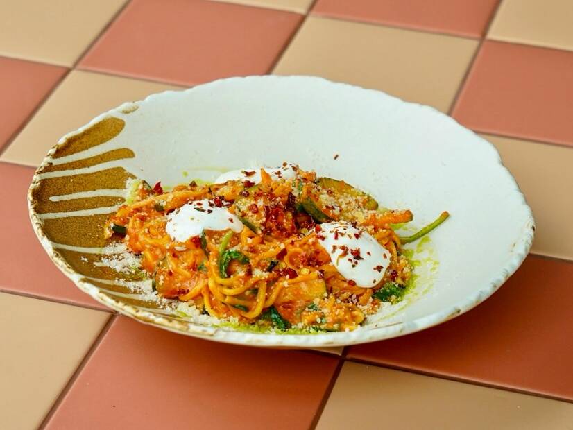 Паста на томатній основі з цукіні, шпинатом, крем-сиром, базиліком та цибулевим кранчем.