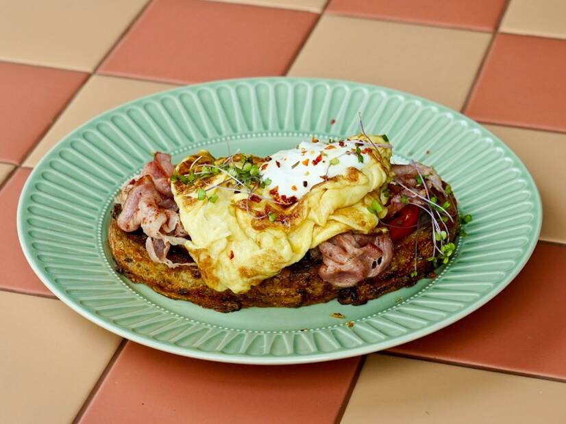 Запечений гречаний тост з беконом, омлетом та крем-сиром.