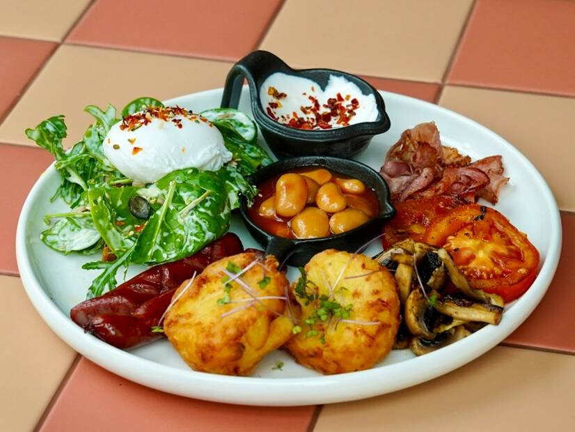 Сніданок до складу якого входить мікс салату із яйцем на вибір (оката, скрембл, омлет, пашот), бекон, печені томати, печериці, квасоля в томаті, крем-сир із сушеними томатами, картопляний гратен та ковбаски гриль.