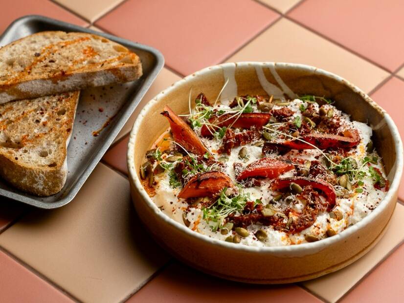 Ніжна кремова основа з сиру, вершків і сметани, щедро доповнена ароматними в'яленими томатами та запеченим перцем, насінням гарбуза, пармезану. Подається з запашним подовим хлібом власної випічки.