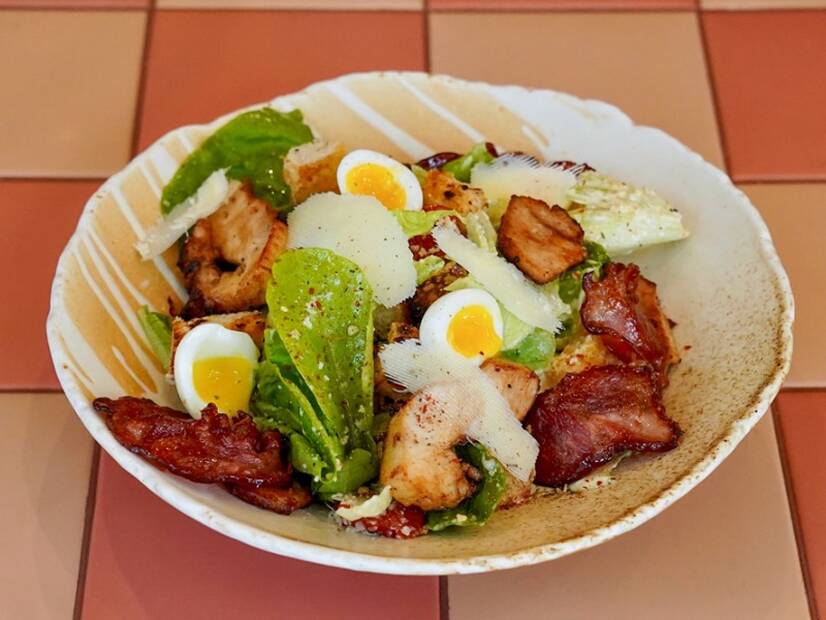 Салат на основі листя ромену й айсбергу з куркою, запеченим беконом із кленовим сиропом, томатами чері, перепелинним яйцем, крутонами, пармезаном та соусом Цезар.