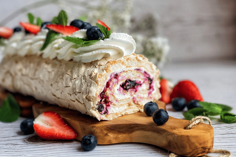 Корж з безе покритий кремом із крем сиру та вершків з додаванням конфі з маракуї-манго. Декоровано вершками і свіжими фруктами.