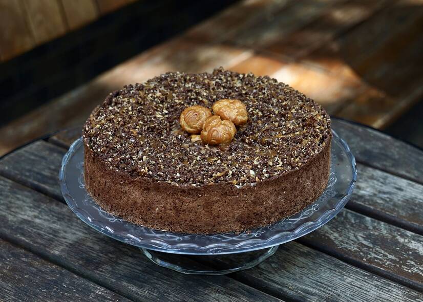 Класичний сирник на шоколадно- апельсиновому коржі, карамелізовані яблука, мигдалевий штройзель та солона карамель.