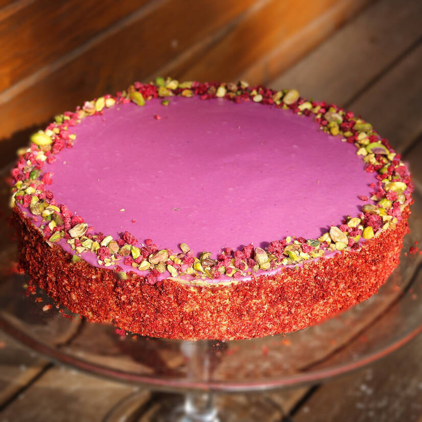 Горіхові коржі ( фісташка та грецьки горіх) без глютену, фісташкови масляний крем,малина, глазур з білого шоколаду.
