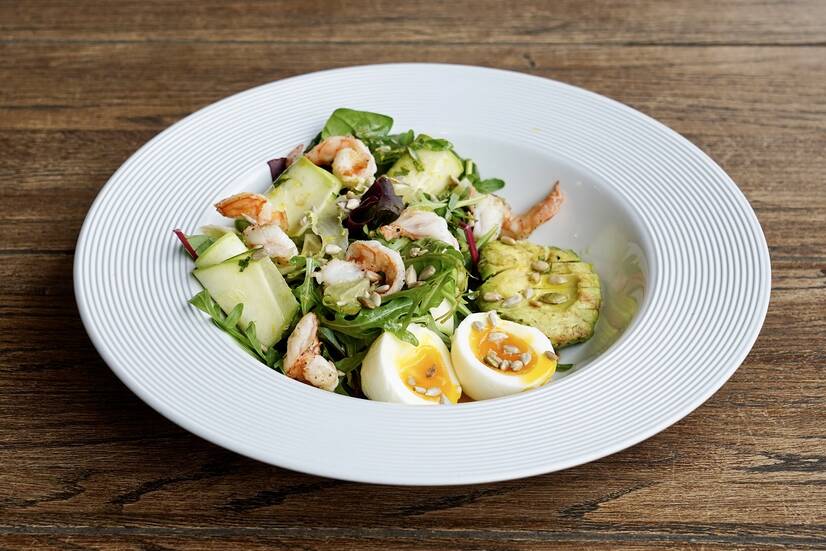 мікс салату / філе лимона / слайси цукіні / слайси огірка / креветки / варене яйце з рідким жовтком / грильоване авокадо та посипане насінням соняшника та гарбуза / цитрусовий соус ( сік лимона / лайма / апельсина та їхня цедра / цукровий сироп / сіль та оливкова олія)