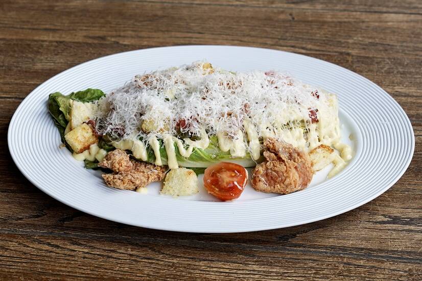 листя ромен грильований / томати черрі / куряче бедро в хрусткій паніровці / смажені каперси / соус цезар ( жовтки / сік лимона / анчоуси / оливкова олія / гірчиця) / сир пармезан